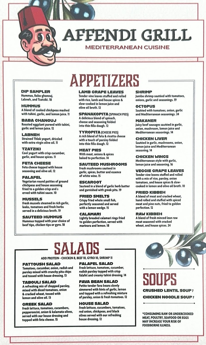 The menu at Affendi Grill is a feast for the senses, featuring a wide range of tantalizing dishes that celebrate authentic Mediterranean flavors. Start your meal with their Dip Sampler, a heavenly combination of Hummus, Baba Chanouj, Labneh, and Tzatziki, perfect for sharing or indulging solo at just $18. Savor the rich flavors of their tender Falafel ($10) or the succulent Lamb Crape Leaves ($12), each promising to transport your taste buds straight to the Mediterranean. Not to be missed, their Calamari ($18) and Escargot ($19) are crowd favorites that have been praised for their impeccable preparation and delightful textures.